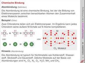 Varianten für die Bindung von Atomen untereinander. Ionische Bindung auf Grund elektrostatischer Anziehungskräfte, die Atombindung über Elektronenpaare und die metallische Bindung über Valenzelektronen. Komplexe Bindungen über Zentralionen