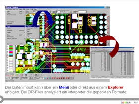 Einlesen der Formate GERBER (Standard und Extended), HPGL, ODB++, Barco DPF, MDA und NC-Drill (Sieb&Meyer, Excellon und Wessel). Editor für D-Code-Listen. Automatischer Import von Daten aus ZIP-Files oder direkt aus Explorern.