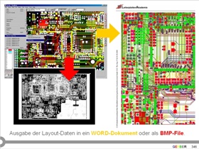 Ausgabe von Gerberdaten in unterschiedlichen Formaten. Layerorientierte Umsetzung in PDF. Farbige oder schwarz-weiße Wiedergabe. Beliebig kommentierbare Vorlagen für die individuelle, vollständige und zuverlässige Integration in die Dokumentation einer Baugruppe.