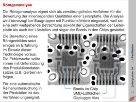 "Leiterplatten 54 …LPVerifikation" erläutert die Komplexität und die Aussgagekraft der Tests, die auf einer Leiterplatte zum Einsatz kommen. Üblicherweise sind niemals alle Eigenschaften einer Leiterplatte mit automatischen Systemen prüfbar. In der Praxis gibt es also keine Prüfung, die für sich alle Qualitäten erfassen kann. Es ist stets ein Prüfszenario erforderlich, das die individuellen Eigenschaften einer Leiterplatte möglichst vollständig erfaßt.