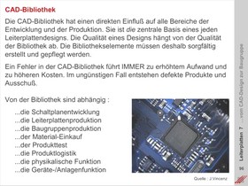 Strategien für die Konstruktion eines CAD-Designs. Designregeln für das Placement und das Routing elektronischer Komponenten. Technologien für die Bestückung und die Montage von Baugruppen. Interaktionen zwischen CAD-Design, Leiterplattenfertigung und Baugruppenproduktion