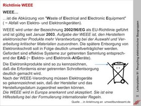 Gegenwärtiger und zukünftiger Einsatz von Baugruppen und/oder elektromechanischer Komponenten im Alltag. Entsorgungsvorgaben nach WEEE und EAG (~ Elektro-altgeräte).